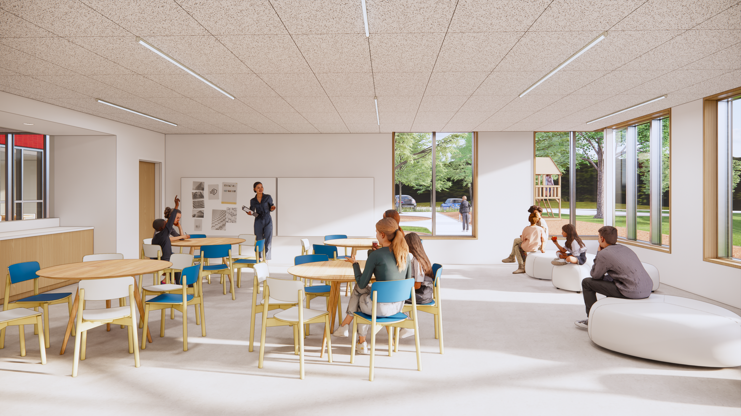 Le projet inclut l’aménagement d’une nouvelle entrée principale, des travaux d’accessibilité universelle et la réfection complète de la cour du préscolaire et de la cour des grands, lesquelles incluent des espaces largement végétalisées. Le dernier étage a fait l’objet d’un traitement plus léger, de sorte à minimiser sa présence sur rue À la demande de la Ville, la nouvelle aile intègre une toiture en pente. La fenestration est positionnée judicieusement afin de maximiser la lumière naturelle, et les vues sur la ville et le boisé, pour assurer le confort des occupants, et maximiser les capacités d’apprentissage des élèves.